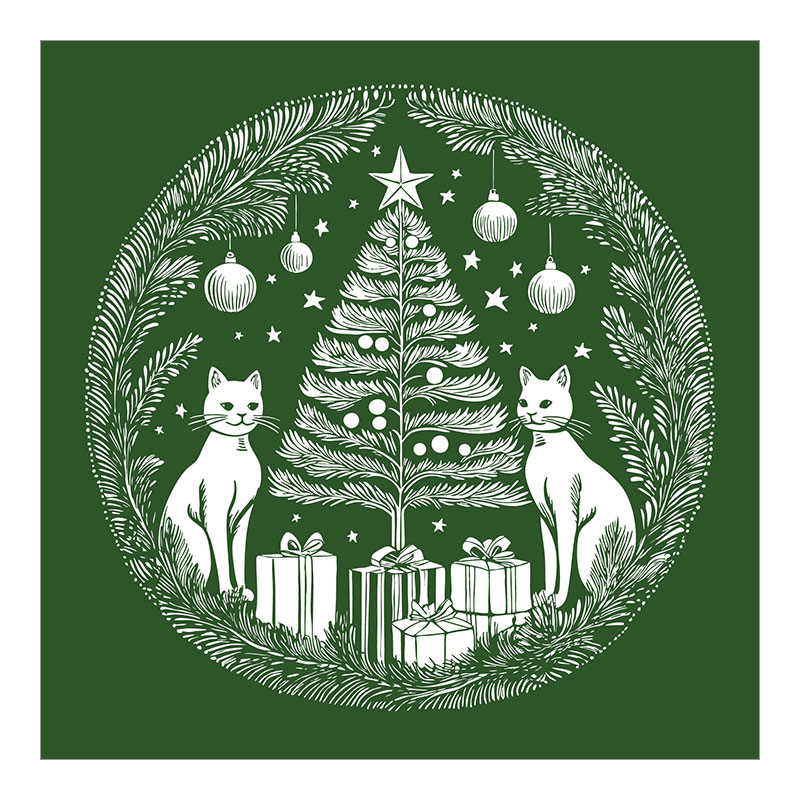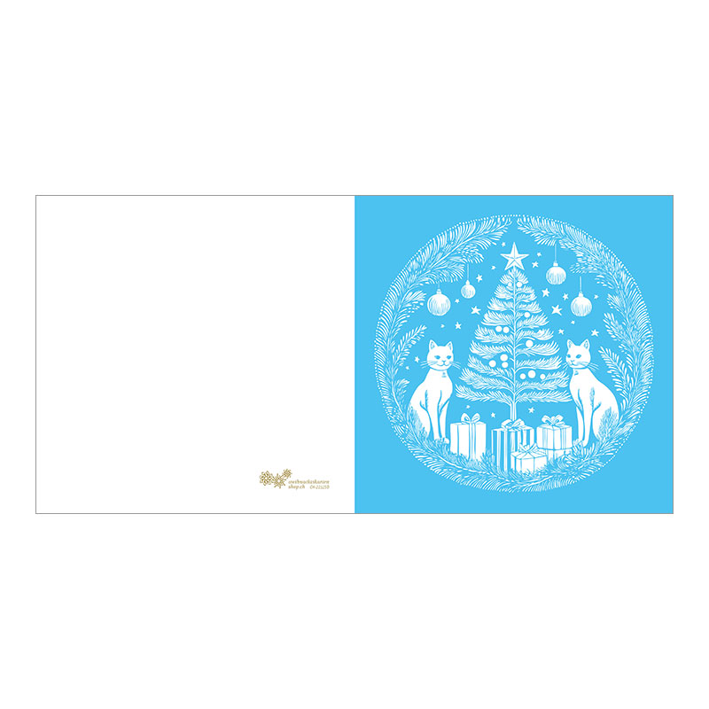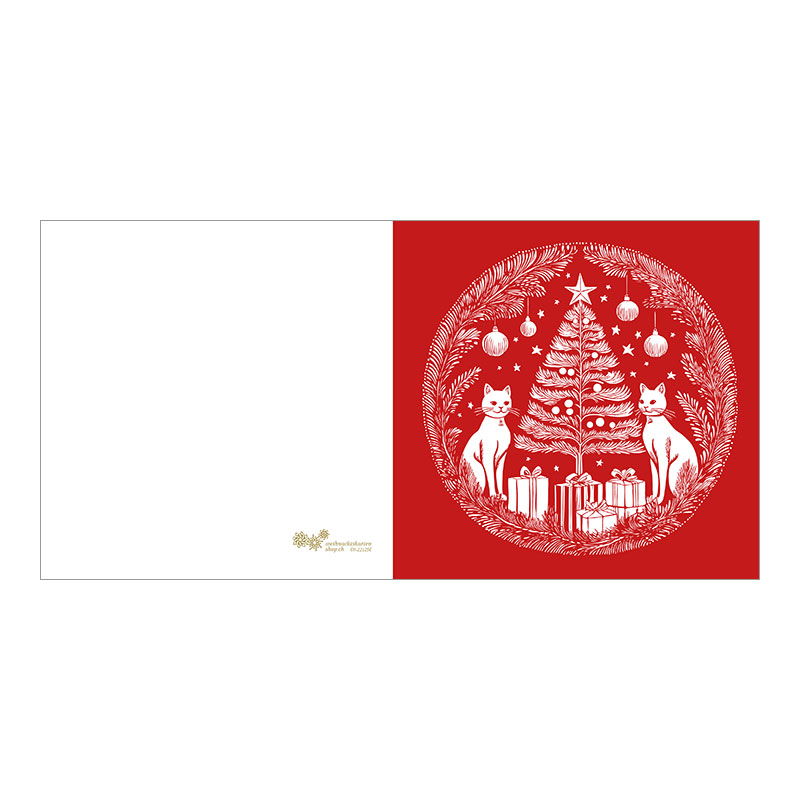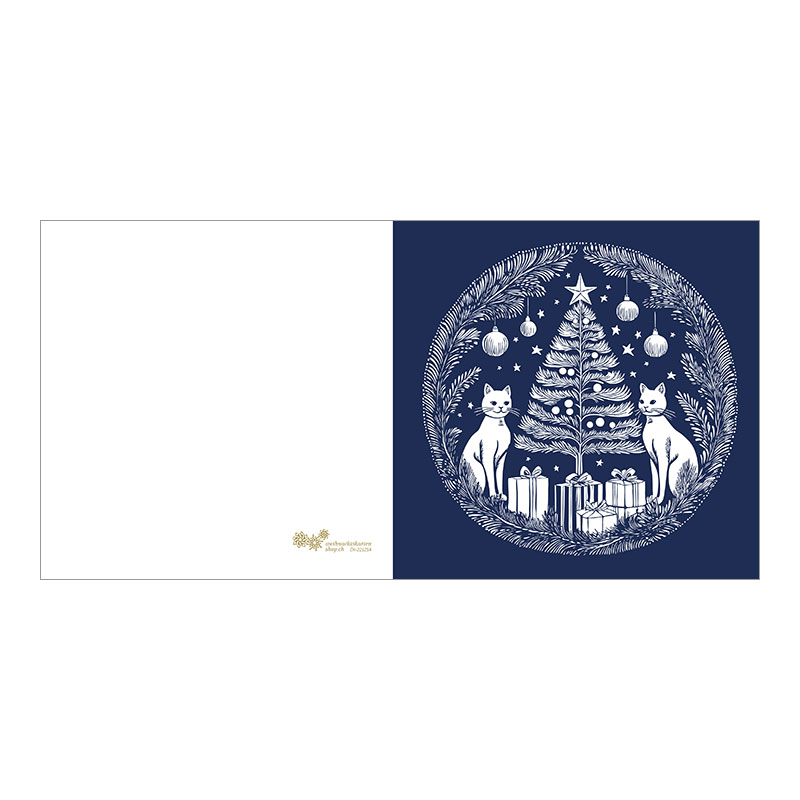 Weihnachtskarte – Festlich «Katzen Weihnachtsbaum». Weihnachtsbaum umgeben von zwei Katzen und festlichen Elementen: Tannenbaum, Katzen, Geschenkpakete, Tannenzweige, Kugeln und Sterne. Farbiger Druck auf weissem Karton. In verschiedenen Farbvarianten erhältlich: Dunkelblau, Dunkelgrün, Rot und Hellblau.