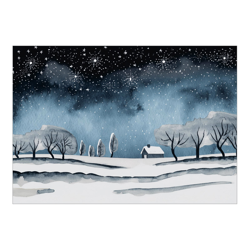 Weihnachtskarte – Design-Karten «Schneelandschaft Aquarell Sternennacht». Fantasievoll gestaltete Schneelandschaft mit Sternennacht im Nebel. Farbiger Druck auf weissem Karton.
